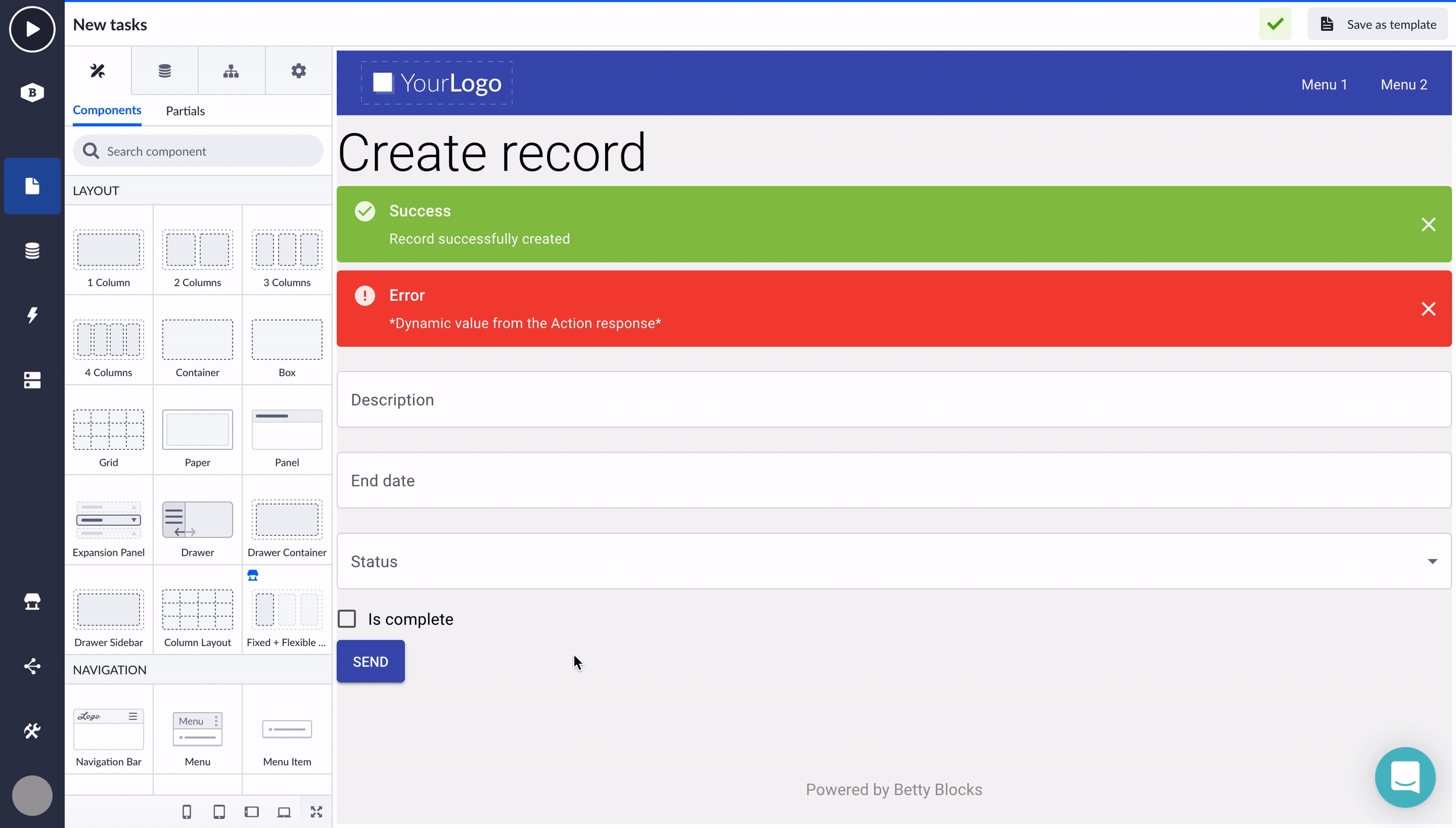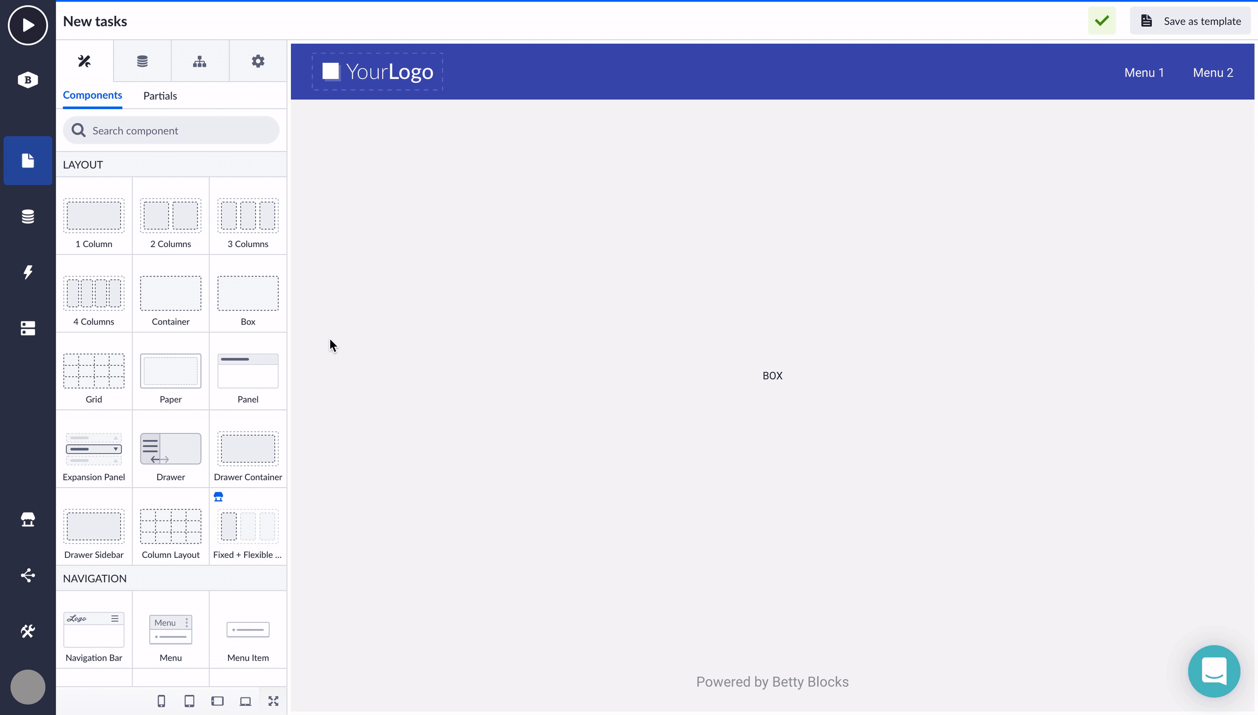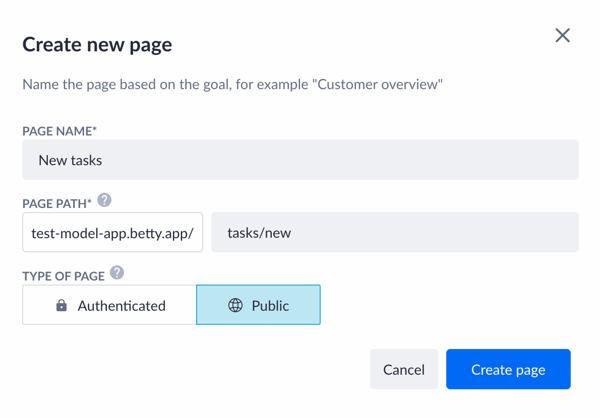 In this use case, we’ll use the Header and footer page template. Let’s call the page New tasks and change the URL to tasks/new. We can keep the page public – only for testing purposes!