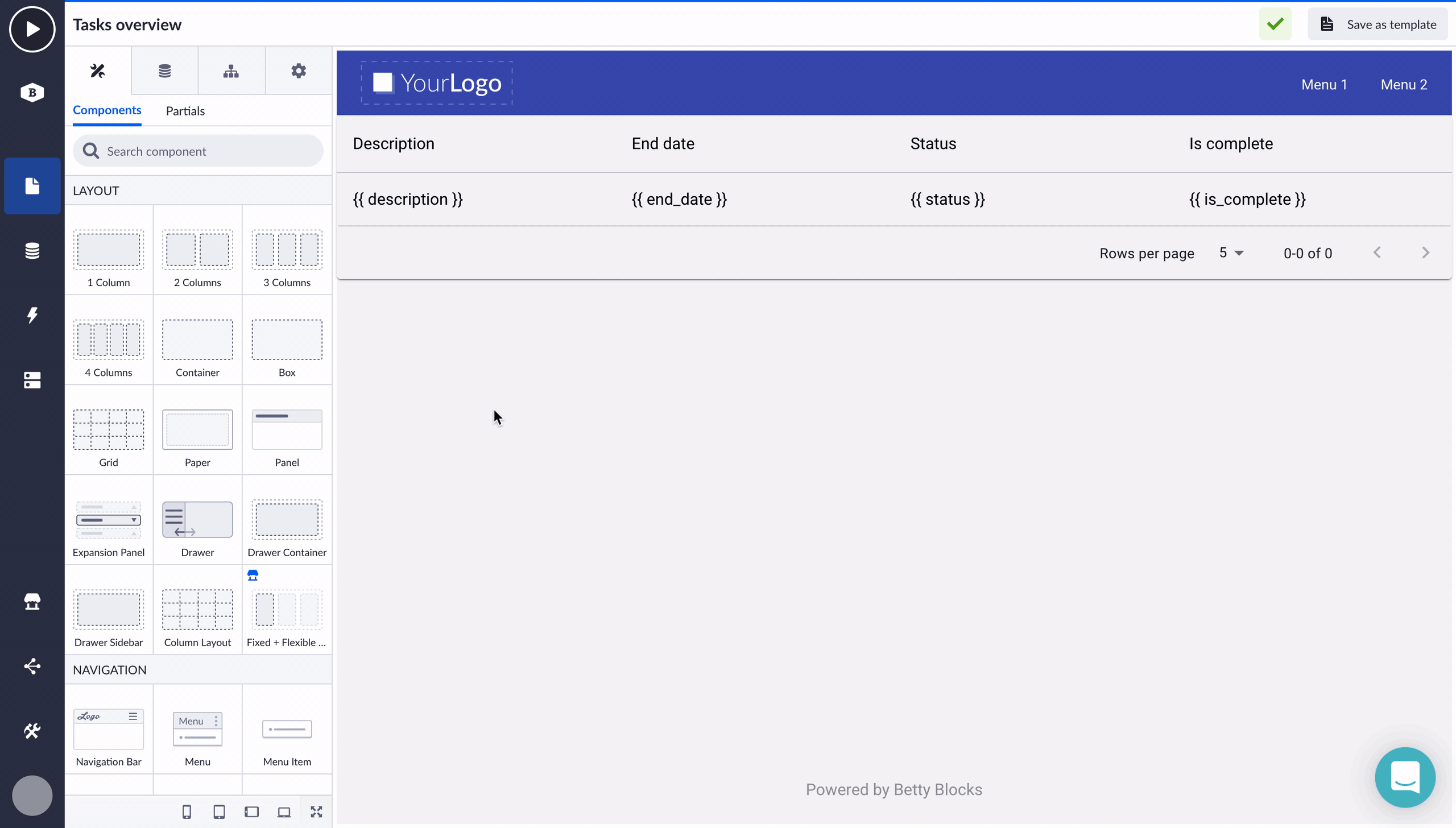 Note: For this example, a Task overview page has already been set up with a data table containing all existing tasks.