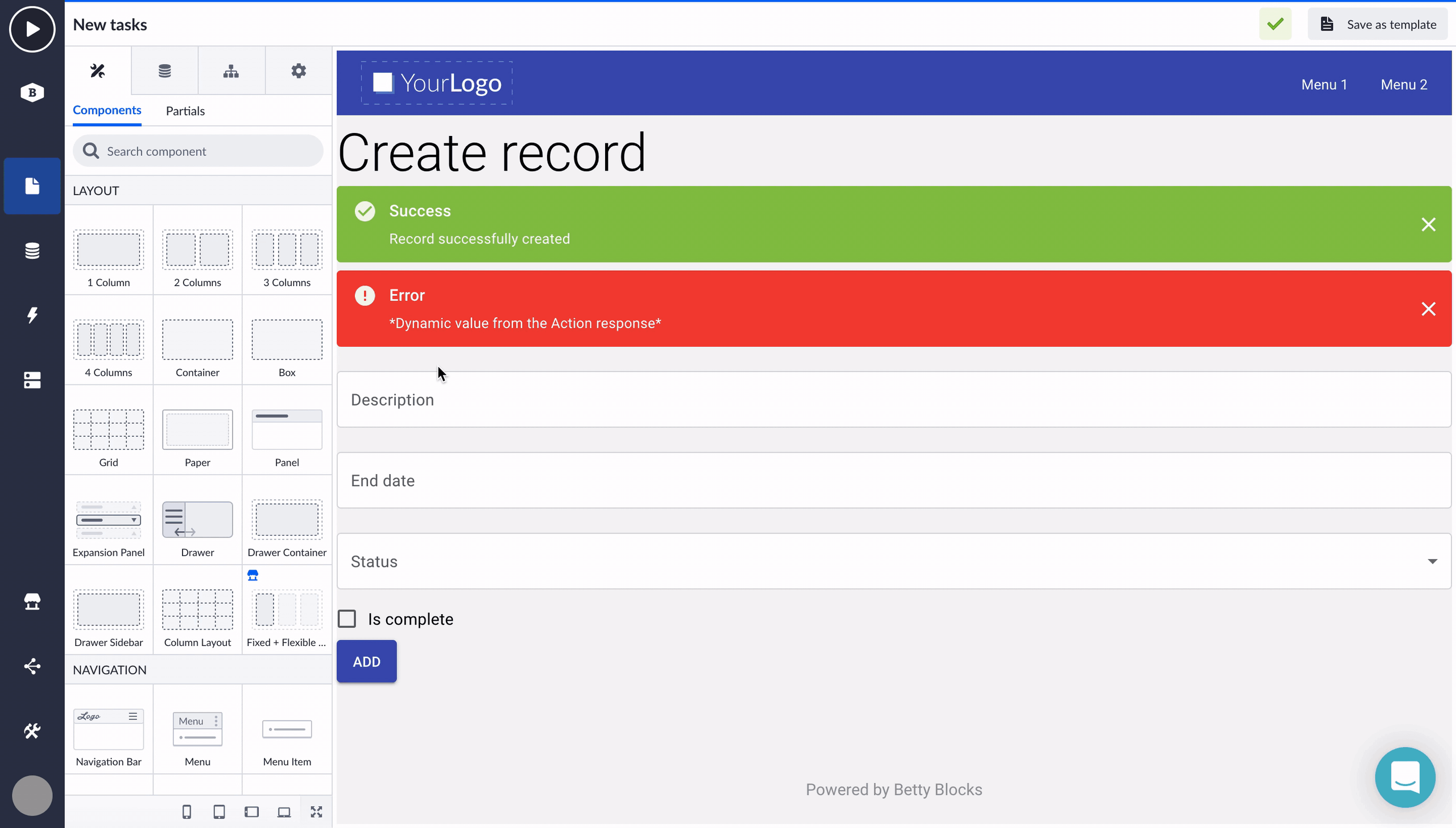 When a task is created successfully, we want it to appear immediately on the Tasks overview. To achieve this, replace the current Success alert interaction with one that redirects to the overview page.