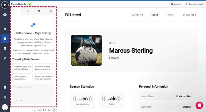 For quick adjustments to specific page components, Betty Genius is available directly on the canvas.