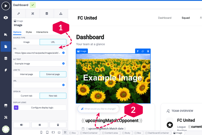 Once added, the component becomes active and you can adjust its settings (1)—for example, choose the image source, add a link to an internal or external page, and more. You can also return to AI-based editing at any time by entering a prompt in the Betty Genius text box beneath the component (2).