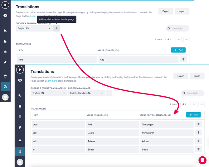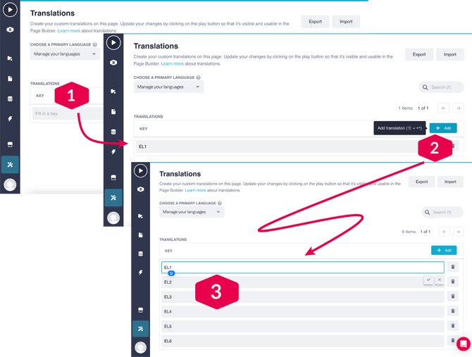 - Import: You can upload a .csv containing a list of keys and translations.