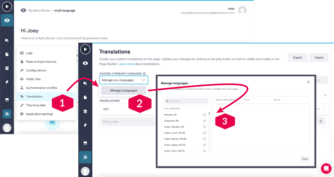 Using the Betty Blocks Translations feature, you can create multilingual applications that adapt to local requirements. The feature works by detecting the active language settings in a user’s web browser. If a translation matching the browser's language is available, the application displays it; otherwise, it defaults to the application's Primary Language.