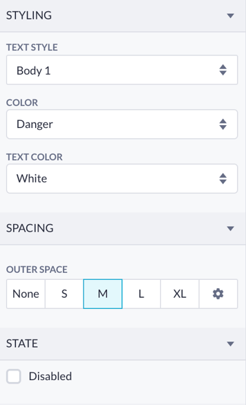 Below you’ll find basic styling options - to customize your Chip's text style, color, and text color. Spacing options only enable you to customize the outer space of this component setting.