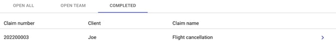 When a company user logs in, they will also see the overview of all claims on the home page. The features available on this page are basically the same as for the client user’s role. The difference is that the company user (with the ‘Teamleader’ permission enabled) is able to view another tab called ‘Open team’ with claims that belong to one particular team.