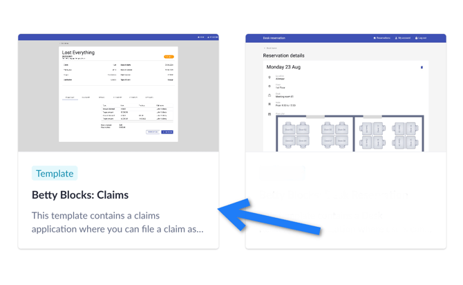 Open My Betty Blocks and see your dashboard with suggested application templates in the ‘Start building’ section. Choose ‘View all templates’, then find the Claims template and click ‘Use template’.
