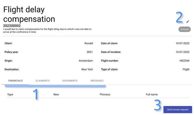 After saving your new claim, you will be redirected to the details page. On this page, the client user has an overview of the details of the claim. Underneath the details of the claims, there are a few tabs. The client user has the following tabs available: Financials, claimants, documents, and messages (1).