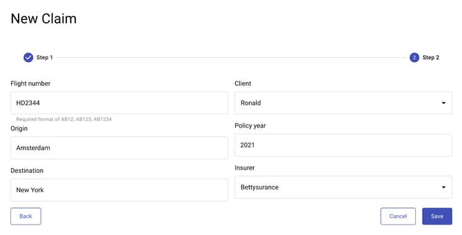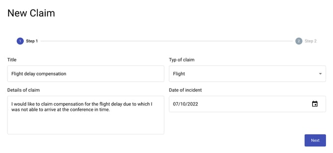 Let’s have a look at how to create your first claim. Click on the ‘New claim’ button in the top right corner (1). All the input fields that are set to create a new claim are required. There are two steps with various fields you have to fill in in order to accomplish each claim:
