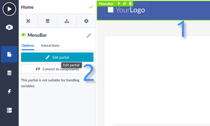 Then click on an empty field of the navigation bar (1). You will notice that it’s a partial that is being reused on other pages as well. Click on ‘Edit partial’ in the menu on the right (2).