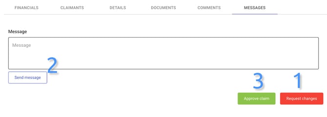 Now a company user can review the claim. If there are changes required for the claim, the company user can change the status of the claim to “Changes required” on the details page (1). A company user is also able to leave a message for the user who created the claim (2).