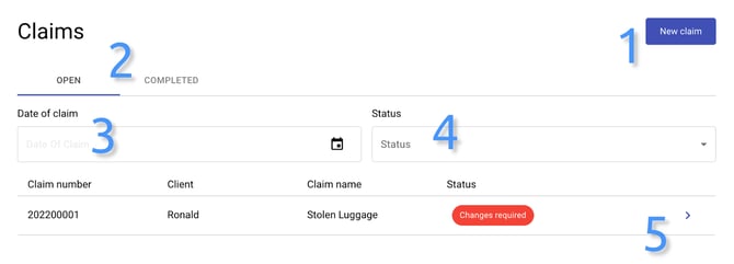 When a client user logs in, they will see an overview of all their claims on the home page. The user is able to create a new claim (1) and see the existing active and finished claims by clicking on the ‘Open’ and ‘Completed’ tabs (2). There’s also sorting by date (3) and status of a claim (4). The ‘Edit claim’ is situated on the right side of each claim (5).