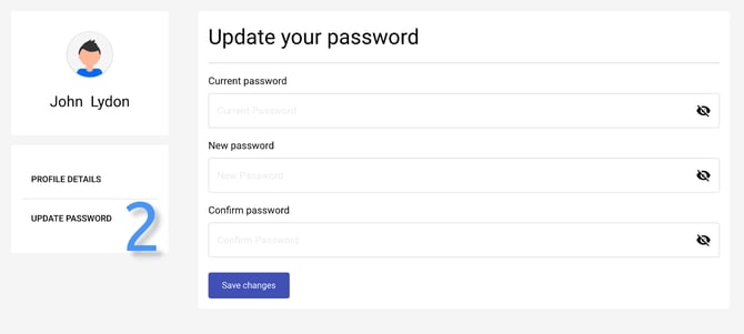 A new tab will open as you click on ‘Update password’ (2). Here you can change your password. Type in your current password and the new one twice. Don’t forget to click ‘Update password’ button when you finish.