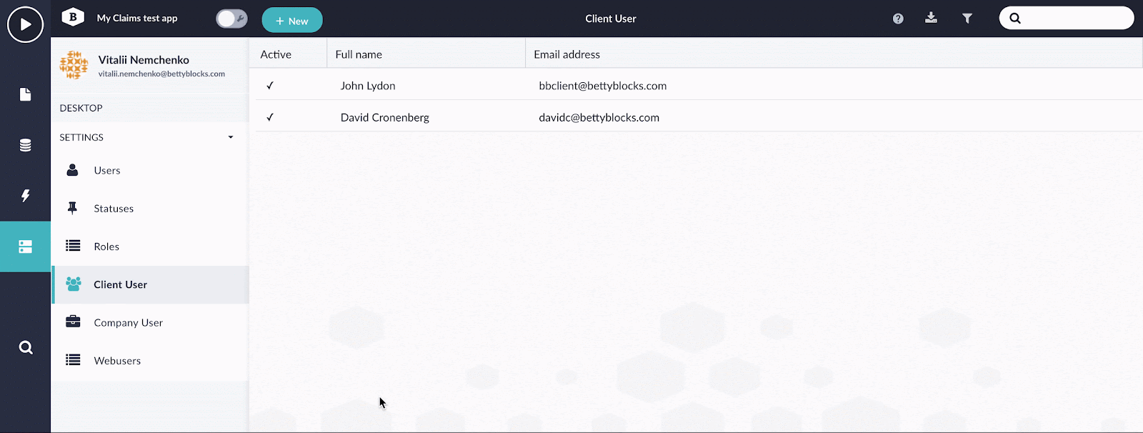 To create a new client user, go to the ‘Settings’ tab in the back office of your application and select ‘Client User'. Click on the ‘New’ button to create a record. The following fields are required when creating it:
