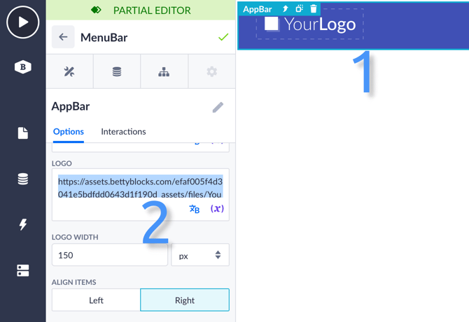Choose the logo media component (1) and replace the initial link with a link to your company’s logo (2).
