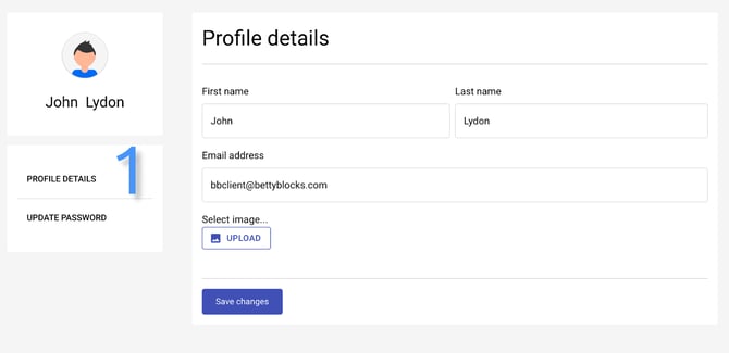 There are two tabs here. Profile details tab (1) is opened by default. Here you can change your first and last name and email address. It’s also possible to set or change the profile image that will be displayed in your application.