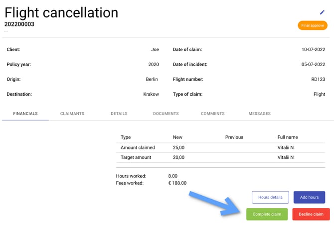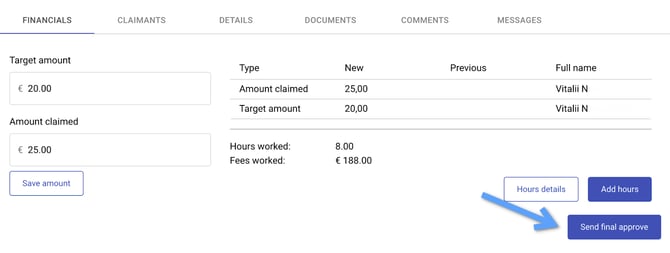 Only a team leader is able to give the final approval or decline a claim. All the other users can just see the details of the claim. When the team leader declines a claim, the status of the claim will be changed to “In progress” and the team leader can leave a message.