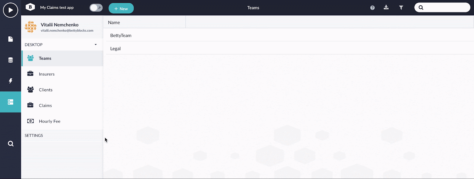 After you have created a new app with the claims template, it will be completely empty of data. To be able to use this template you need some data to start with. You need at least one team, one client, one company user and one client user.