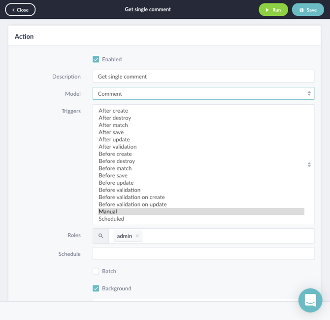 Specify a Description, as this is required in order to create an Action. Select the right Model for your Action. Keep the trigger on Manual. Your form should look something like this: