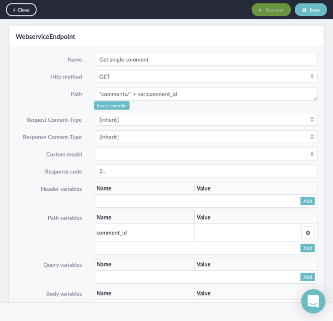 Specify a Name and Path for the Webservice, as these are required in order to create an Endpoint. Create a new Path Variable named comment_id, and insert this variable into your path using the Insert variable button. Your form should look something like this: