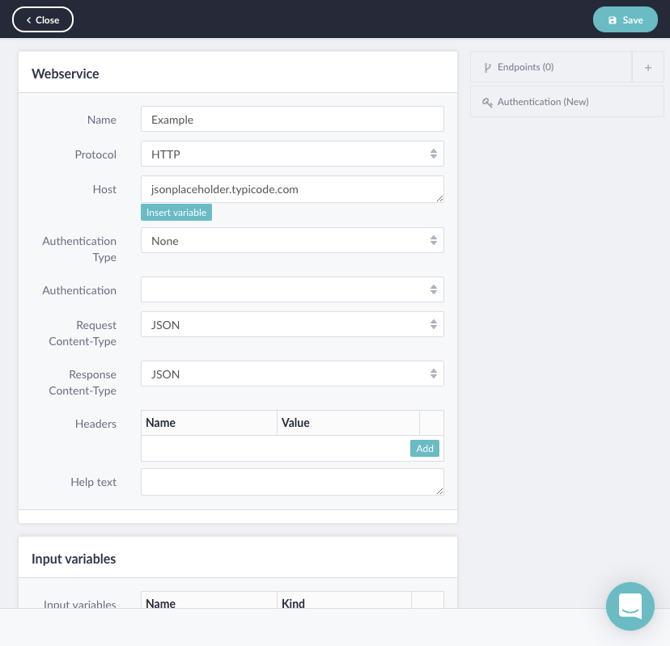 Click on the + button located next to the endpoints button in order to start creating an endpoint for your webservice. A form will appear, where additional settings can be set.