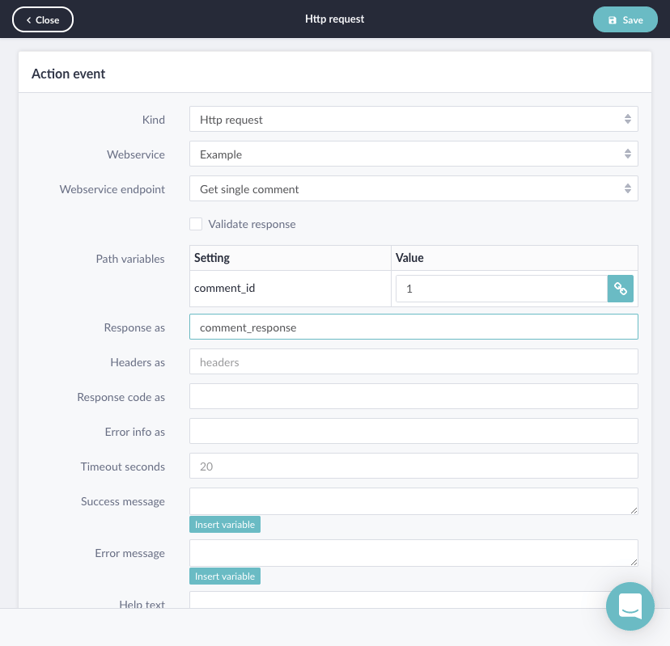 Select the Http request event option in the Kind dropdown. Select the Webservice and Webservice endpoint that you want to use for the action. Insert the path variable from the variable browser. In this case, just use a static number(1) but you can also make it dynamic by using a variable. Last but not least you have to give the response a variable name for further processing. Your form should look something like this: