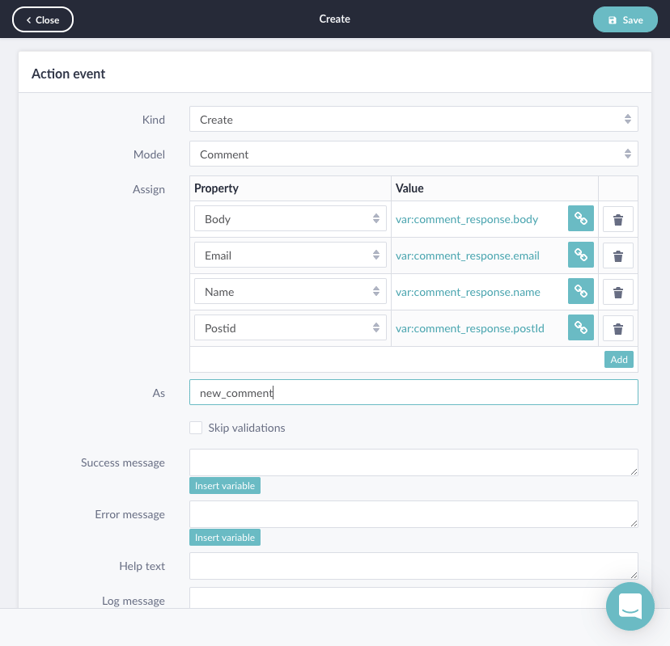After you’ve created the Http request Action event you’ll have to create a new Action event. Create a Create Action event in order to create the record and save it into your Back Office. Select the Model that you want the record to be saved to, now you’ll have to assign every property to the attributes of our Custom model. Your form should look something like this: