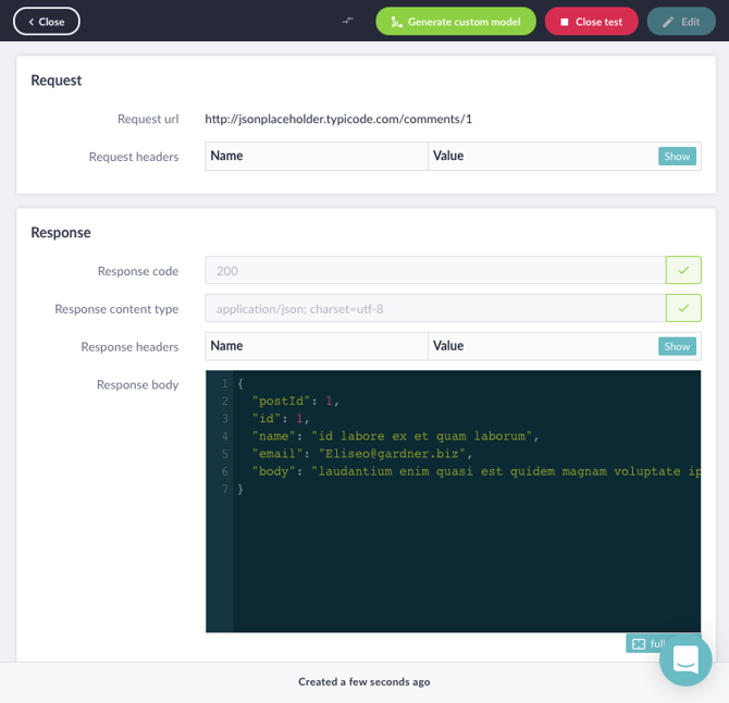 Click on the Run test button located in the top right corner. A popup will show where you'll have to fill in a comment_id. Press the Run test button after you’ve filled in the id in order to start the test. You should get a response page that looks something like this: