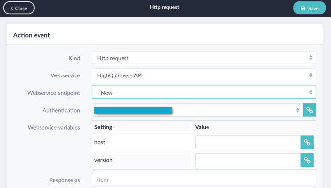 For example, select the “To get a list of iSheet items” endpoint. After selecting the endpoint you will have to fill in the Host and Version settings of your HighQ connection. You can fill these in by hand or create a configuration that holds the information.