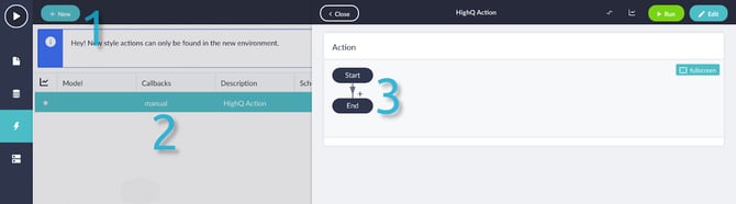 Click on ‘New’ to create a new action (1), make up a description for it and save it. Then you need to click on the newly created action to open it (2). In a slide-out panel, click on ‘+’ to add a new action step (3).
