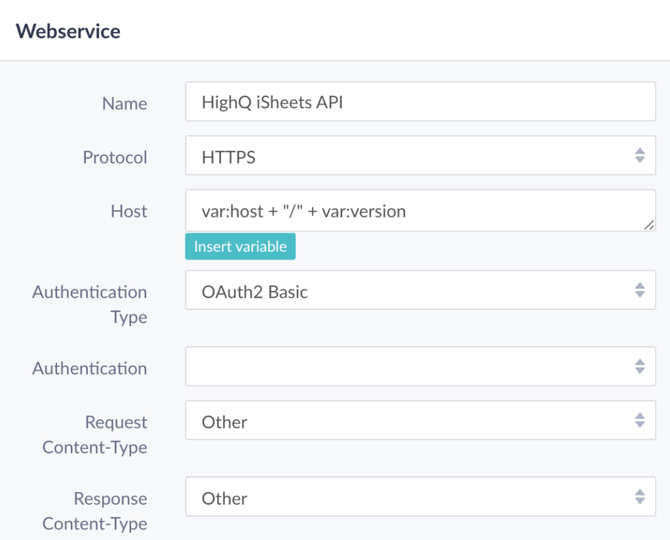 When accessing the web services section, you can view the installed HighQ iSheets connection. The next thing you have to do is to configure some details before we can use the functionalities generated by the block.