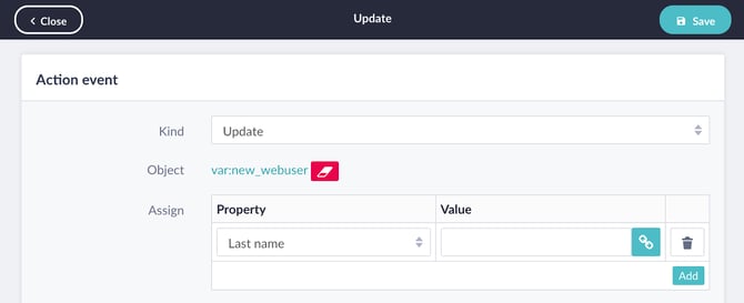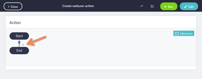 First of all, let’s add the ‘Create webuser’ action. Click on “+” to create an action step.