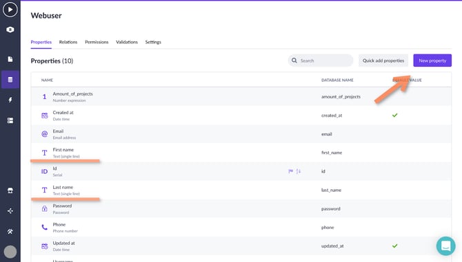 After the ‘Webuser’ model is open, you will see all of its properties in the list. The underlined ones - ‘First name’ and ‘Last name’ are those that we will use to combine in the new property that will be called ‘Full name’.