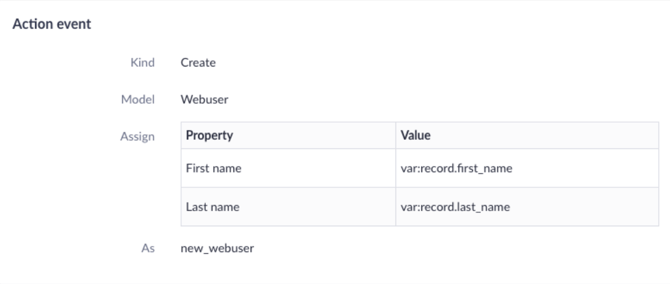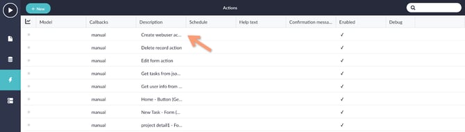 Here you will see different actions generated via the page builder. The action we need is the ‘Create webuser action’. Click once to open it.