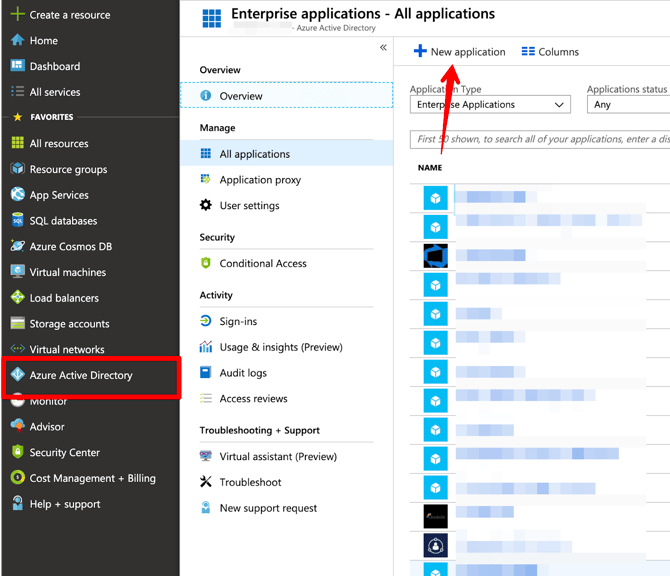 Go to Azure Active Directory, go to enterprise applications, choose + New application, as shown in image below.