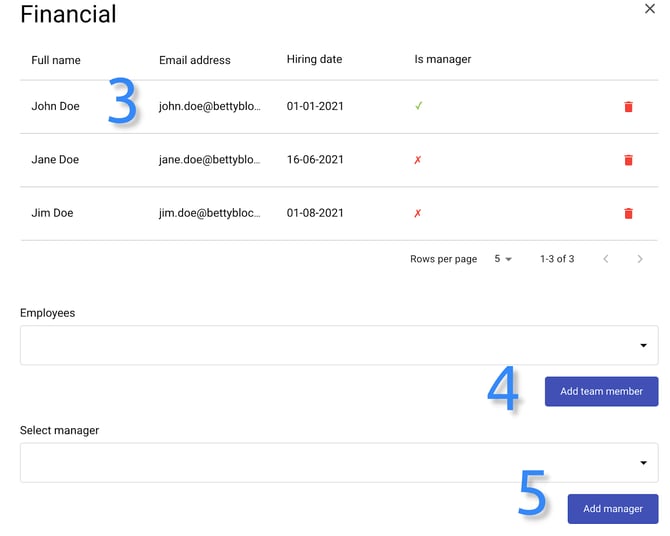 The editing team view contains the overview of the team members (3), adding team members (4) or manager from all employees (5).