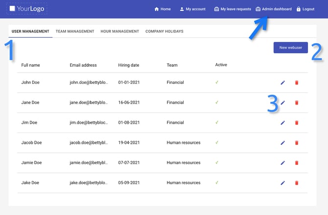 At the admin dashboard, you can switch between four tabs (1), the first one open by default is ‘User management’ the administrator sees all users with their details: full name, email, hiring date, a team they belong to, and whether they are active. The button ‘New webuser’ enables adding a new user. By hitting two icons on the right (3), the administrator can edit the user’s details or delete users.