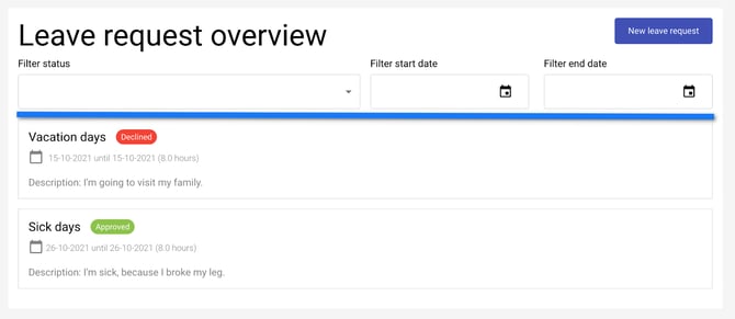 Leave request overview. The page shows the leave requests with filtering by status, start and end dates.