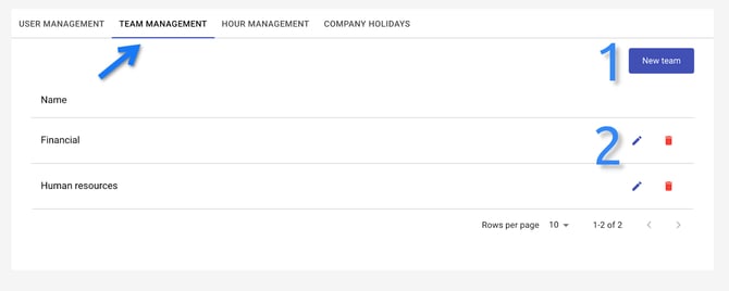 The team management page enables the admin to add new teams (1) or edit and delete existing ones (2).