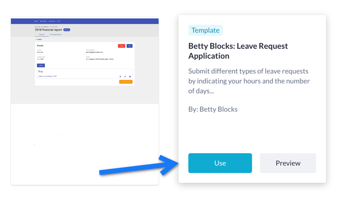 Open My Betty Blocks and see your dashboard with suggested application templates in the ‘Start building’ section. Choose ‘View all templates’, then find the Leave request template and click ‘Use template’.