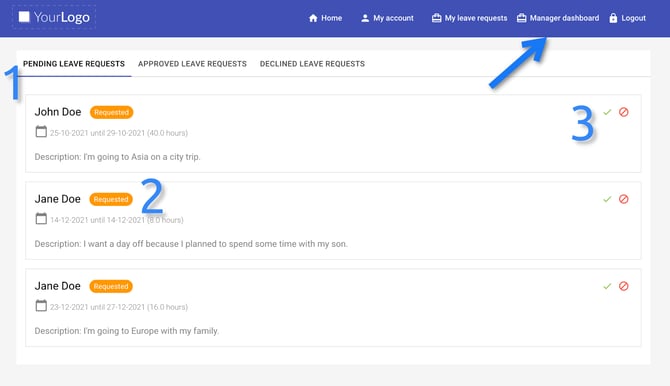 The manager dashboard consists of three tabs (1) that you can switch between: pending leave requests (employees’ requests that need to be processed), approved, and declined requests.