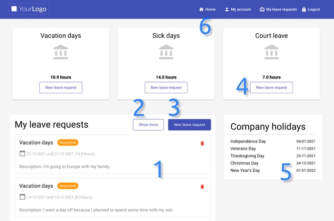 Cards showing types of days off with hours remaining for an employee to use up (4). The ‘New leave request’ buttons underneath each card will take users to the creating a new request page, and the hours type (vacation days, sick days, court days) will be set accordingly to the chosen card. There is also a table showing planned company holidays for users (5).