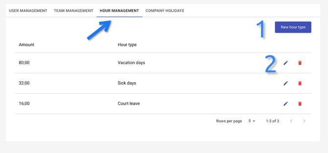 Through the hour management, the admin can add the new hour type (1) - a new kind of leave days (maternity leave, for example) or edit and delete the existing ones (2).