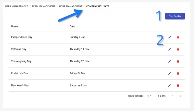 Lastly, there is the company holidays tab. Within this one, the admin can add (1), edit, or delete (2) yearly holidays, like Christmas, Independence Day, etc.