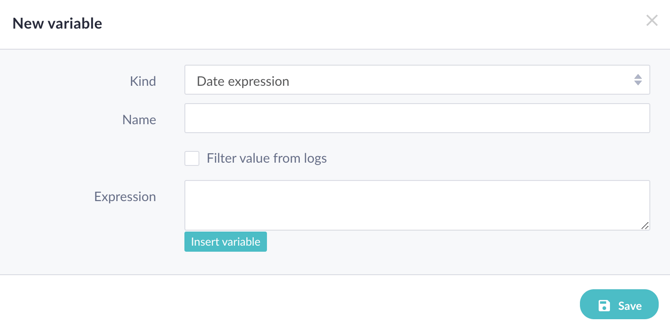 This variable is an expression variable, so its value is automatically calculated and can't be manually changed. It is used for generating a Date value based on the expression entered in the Expression setting.