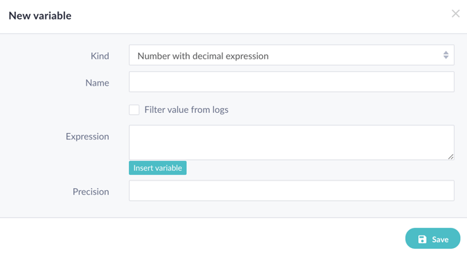 Expression: Define the expression that determines what the variable's outcome should be. Insert variables and expressions to create custom functionality. The expression should have a valid number (with decimal) as outcome. If this is not the case, the variable will be empty.