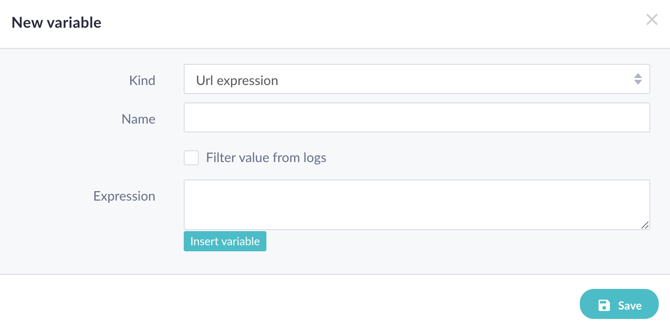 Expression: Define the expression that determines what the variable's outcome should be. Insert variables and expressions to create custom functionality. The expression should have a valid URL as outcome. If this is not the case, the step where the variable is included will fail.