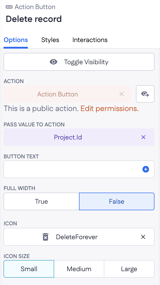 Make sure that within the Action button options, the model ID (Project.Id) is passed through to the action. As a best practice, we also recommend renaming the button from ‘Action Button’ to something like ‘Delete record’. This way, you will be able to find it within your component tree easily.