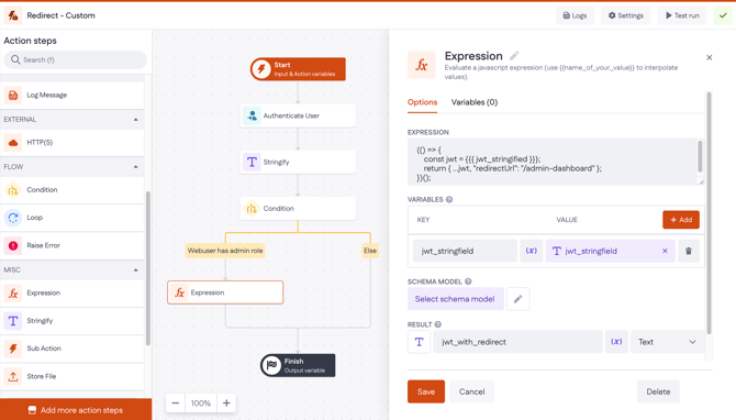 - Expression — for each role branch, inject the redirect URL into the JWT: