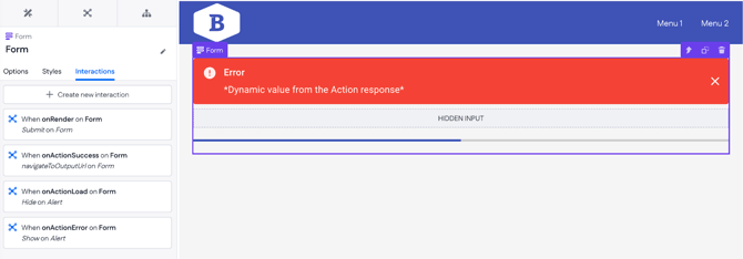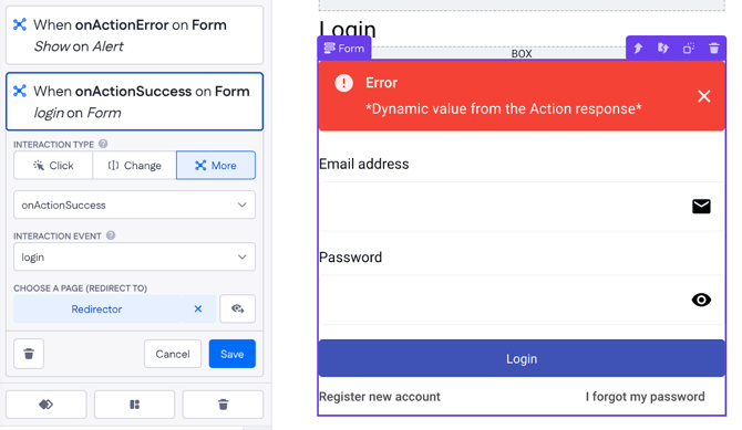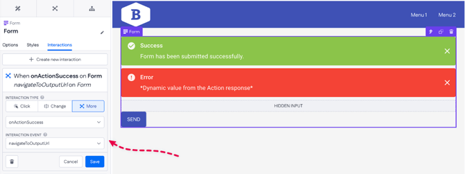 3. On the Form component, set the onActionSuccess interaction to navigateToOutputUrl