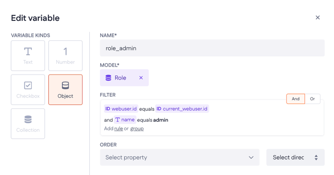 - Add an Object variable (Condition > Variables > +Add) with a filter to retrieve the logged-in user's role from the authentication profile